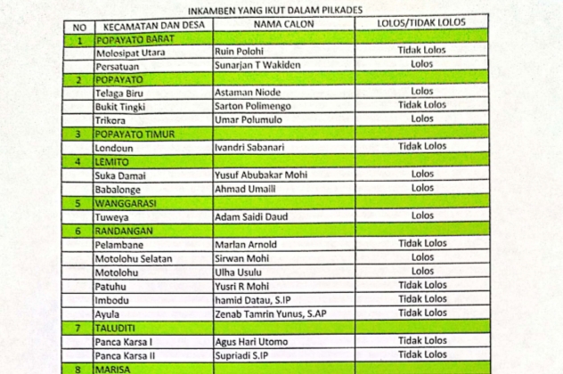 MBharGoNews.com, Pohuwato – 22 calon kepala desa petahana tumbang dan harus gigit jari setelah gagal terpilih dalam pelaksanaan Pemilihan Kepala Desa (Pilkades) serentak di 62 desa se-Kabupaten Pohuwato, Provinsi Gorontalo, Rabu (10/08/2022).