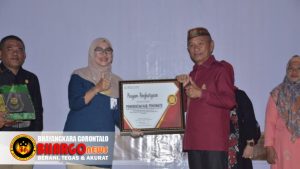 Selanjutnya, pemberian piagam penghargaan dari BPJS Cabang Gorontalo kepada Dinas Sosial, Dinas Kesehatan dan Dinas Dukcapil. Kemudian piagam penghargaan dan plakat dari BPJS Kesehatan kepada pemerintah daerah yang diserahkan Deputi Direksi BPJS Kesehatan, Wilayah Sulawesi Utara, Sulawesi Tengah, Gorontalo dan Maluku Utara, dr. Mediyanti Elya Permata Sari, AAK dan diterima Bupati Saipul Mbuinga.