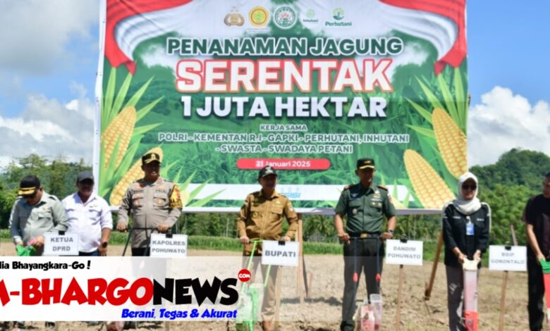 MBharGoNews.comĀ – Program penanaman jagung serentak seluas 1 juta hektare resmi dimulai di lahan pertanian Kelurahan Libuo, Kecamatan Paguat, Pohuwato, Selasa (21/01/2025). Kegiatan ini merupakan hasil kolaborasi antara Polri, Kementerian Pertanian RI, GAPKI, Perhutani, Inhutani, pihak swasta, serta swadaya para petani.