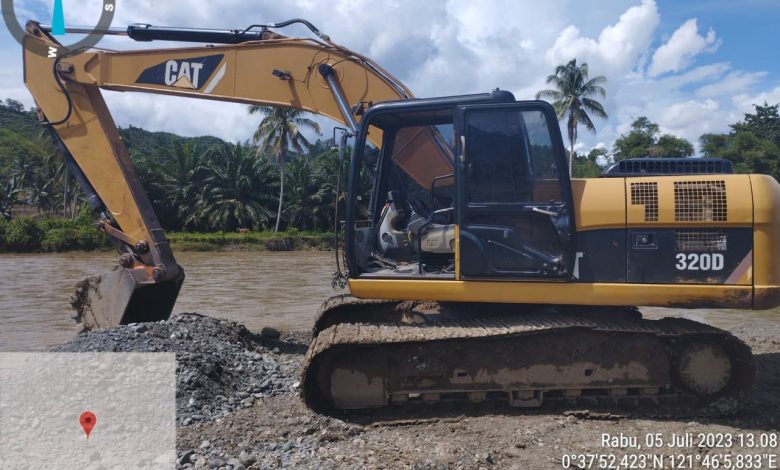 M’Bhargo-Pohuwato, Alat berat jenis Excavator sedang melakukan kegiatan pengambilan material di sungai Aktif.Alat berat tersebut terpantau sedang menumpuk material jenis pasir dan batuan di sungai malango